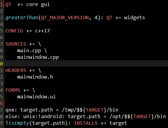 SOURCES += 、HEADERS += 、FORMS += 分别表示包含的源文件、头文件、ui文件(注意\表示换行)