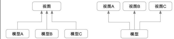 左图表示一个视图对应多个模型,表示用户在一个界面上查看不同模块的内容,例如打开某地图app,画面不仅有地图,还有天气等信息。右图表示一个模型对应多个视图,表示用户在多个界面查看同一模块的不同部分,例如火箭升空,地面操作人员在不同的区域查看火箭不同部分的实时信息。