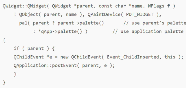 结论:如果parent参数非空的话,那么该构造函数使用了其父窗口的调色板,并且发送了QChildEvent事件,这会让新的窗口成为parent所指窗口的子窗口,那么当父窗口被删除时,子窗口也会自动的被删除。
